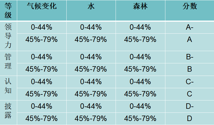 4、领导力等级:领导力等级代表公司提出的行动力度,达到与CDP合作推进环境管理的组织制定的最佳实践(例如CEO水资源管理倡议、CERES、WWF),同时对环境风险机遇具备透彻理解,并制定和实施战略以减轻或利用这些风险机遇。